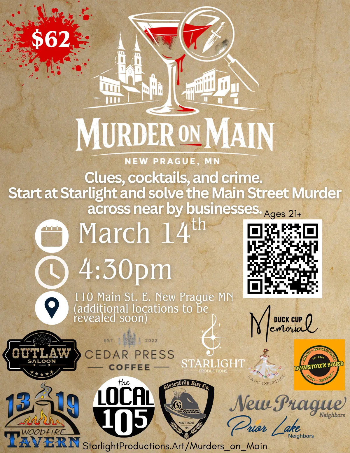 Murder on Main Pub Crawl is meant to be a fun, safe evening for everyone. We encourage all participants to drink responsibly, know their limits, and plan ahead for safe transportation. Starlight Productions is not responsible for overconsumption. Let’s keep the night memorable for the right reasons!